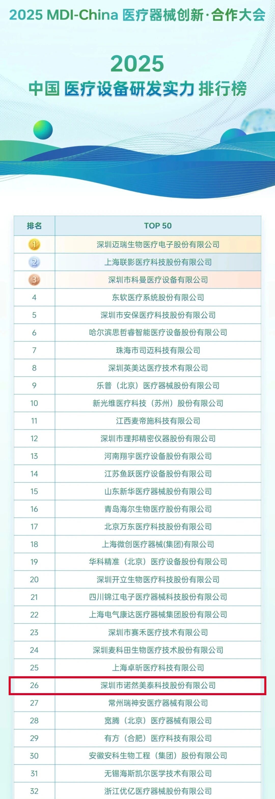 Recently, the "2025 China Medical Equipment R&D Strength Ranking TOP50" was jointly released by Yaozhi.com and authoritative organisations, and the results were officially announced. Shenzhen Northern Meditec Technology Co., Ltd. was successfully selected and ranked 26th due to our technological breakthroughs and profound accumulation in the three major fields of respiration, anaesthesia, and monitoring.
